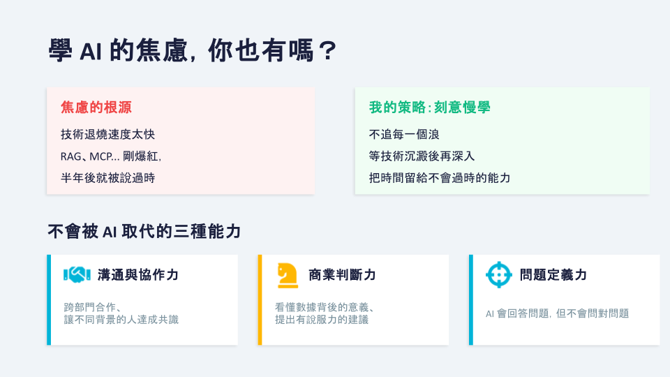 從 RAG 到 MCP,每一個新名詞都是剛推出就爆紅,結果半年後可能就被說過時了,永遠追不完。面對這種資訊焦慮,我的應對策略是:「刻意慢學」。