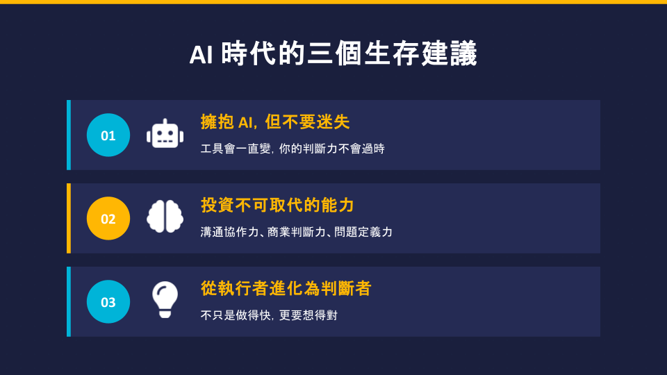 投資不可取代的能力: 刻意培養溝通協作力、商業判斷力與問題定義力。不管 AI 怎麼進化,這都是人類獨有的籌碼。