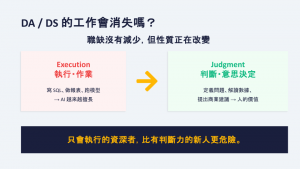 過去,DA 或 DS 的價值很大一部分建立在「執行(Execution)」上,像是寫 SQL、撈數據、做報表、跑模型。這些事情,AI 確實已經越來越擅長。但現在更重要的,是「判斷(Judgment)」,也就是定義商業問題、解讀數據背後的真義、提出有說服力的行動建議。這才是人類在這個角色中無可取代的價值。